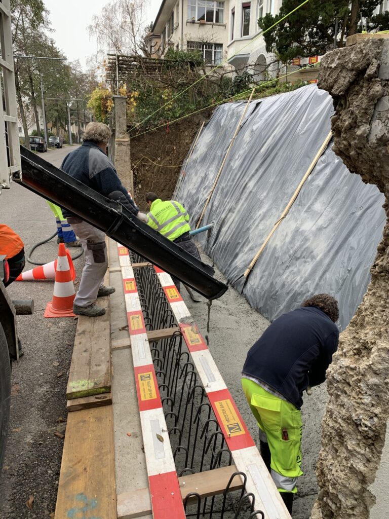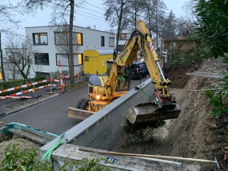 Die Stützmauer musste aus Altersgründen ersetzt werden. Die Arbeiten wurden mit eigenem Gerät unter beengten Platzverhältnissen ausgeführt. Der Verkehr inklusive Busverkehr hatte während der gesamten Bauzeit von 3 Wochen nur wenig Einschränkungen.